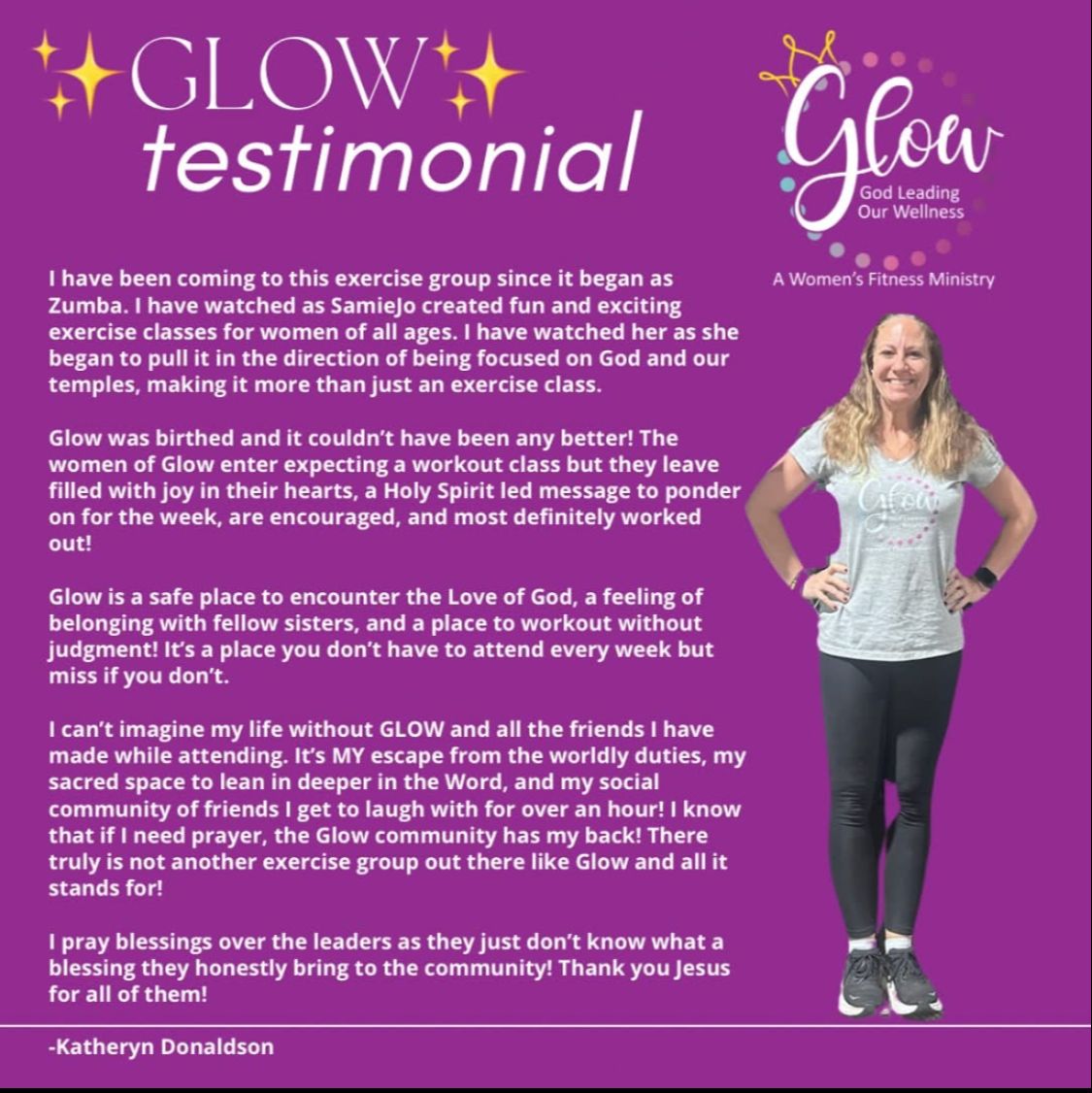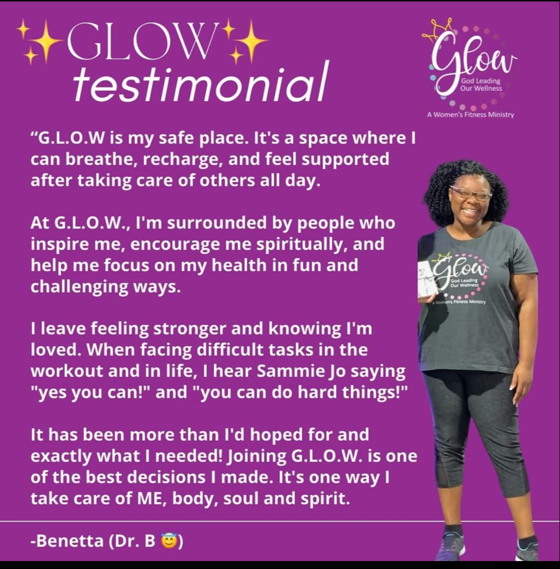 "In 2023, I did a 6 week fitness challenge. With the challenge, you paid an upfront fee. At the end of the challenge, if you met the goal weight then they refunded you the money. The first couple of weeks were fine. By week 3, I felt like I was in prison and the instructors were the prison guards and wardens. I joked with the staff that I would had a release date. I hated it. Knowing I had a release date I began to ask God for another fitness class. After Life Group one Wednesday, my life group leader introduced me to Candi, a GLOW instructor. I asked about her GLOW T-shirt. She explained that GLOW was a Christian's wellness and fitness ministry that was entirely FREE! God surprised me. I went to the first class with lots of trepidation. I hoped it wouldn't be like that other class with loud music and unrelenting exercises. I enjoyed the workout and the MUSIC. The music was life giving and engaging. I was hooked. I am building relationships. I am thankful for this ministry".